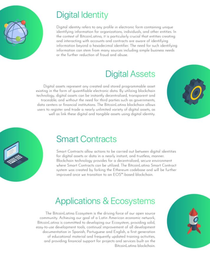 BCL은 라틴아메리카 내에서의 파트너십과 전략적 기술 획득을 통해서, 탈중앙화된 application(Dapp)을 위한 생태계를 만들어나가고 싶다는 비전을 가지고 있습니다. 또한 기존 Bitcoin(비트코인)이 표방하는 peer-to-peer, decentralized networks 와 같은 기조를 따른다고 이야기 합니다. 이 때문에 이더리움 포크 기반의 블록체인이면서도 이름을 Bitcoin Latina라고 명명한 것 같습니다. BCL는 Digital Identity, Digital Assets, Smart Contracts, Applications&Ecosystems 등을 내세우고 있습니다.