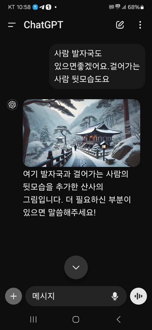 ChatGPT 그림솜씨kdy8998kk (80)in #kr • last year 눈 내린 고요한 산사의 그림 좀 그려주세요~ 순식간에 적막이 흐르는 고요한 산사 그림을 그려주는 ChatGPT! 세상은 이제 AI가 책도 쓰고 영화도 제작하고 ..... 변화는 이미 우리가 미처 알아채지 못한 분야까지 깊숙히 진행중이다~ AI와 친숙해져야 할 것 같다. #krsuccess #steem