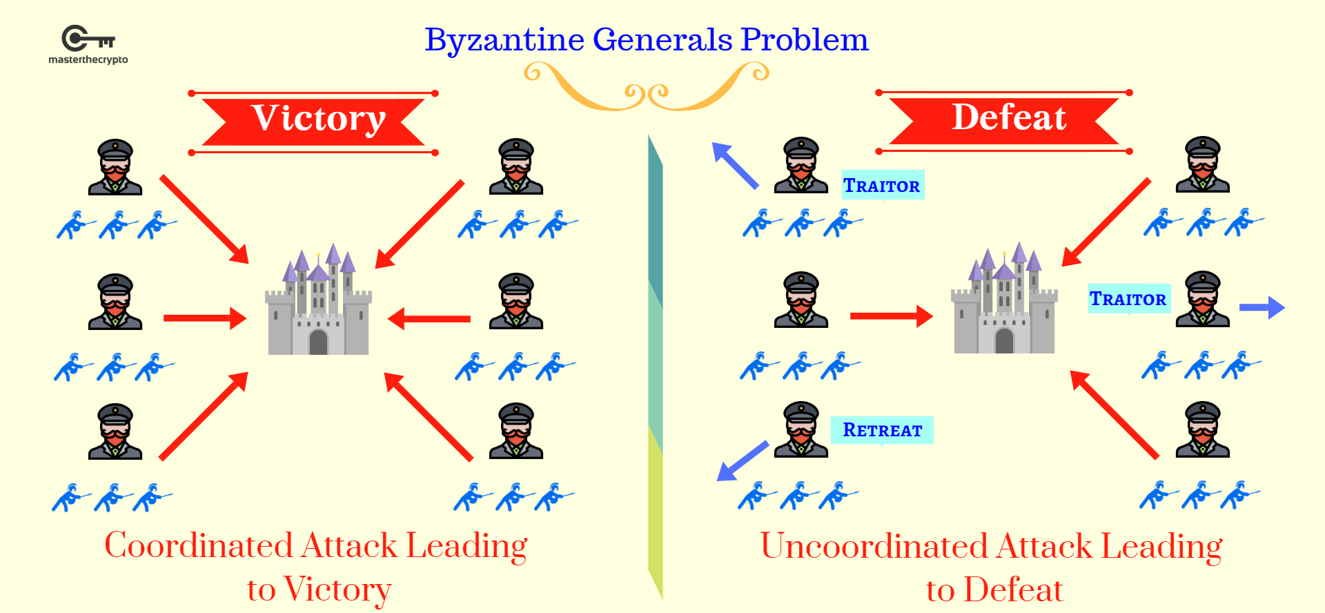 분산 네트워크 연구에서는 오래 전부터 하나의 난제가 존재했습니다. 바로 '비잔틴 장군 문제'입니다. 1982년 레슬리 램포트, 쇼스탁, 피스가 마이크로소프트의 의뢰를 받아 공동으로 연구한 논문에서 이들은 분산 네트워크 환경에서 발생할 수 있는 통신 문제와 그 해결법을 다룹니다. 이 논문의 제목이 '비잔틴 장군 문제'인데, 여기서 적 도시에 대한 공격을 앞 둔 비잔틴 장군들의 합의 과정을 예시로 듭니다. 성 하나를 포위하고 있는 장군들은 서로 지리적으로 떨어져 있고, 동시에 통신할 수가 없습니다. 게다가 이 중에는 배신자가 있어 통신 메시지를 위조할 위험도 있지요. 정해진 시간에 동시에 출병해야 이 성을 함락할 수 있고, 배신자가 있다고 가정하면, 통신 메시지는 어떻게 전달해야 하며, 충직한 장군의 수는 몇 명 이상이어야 할까요?
