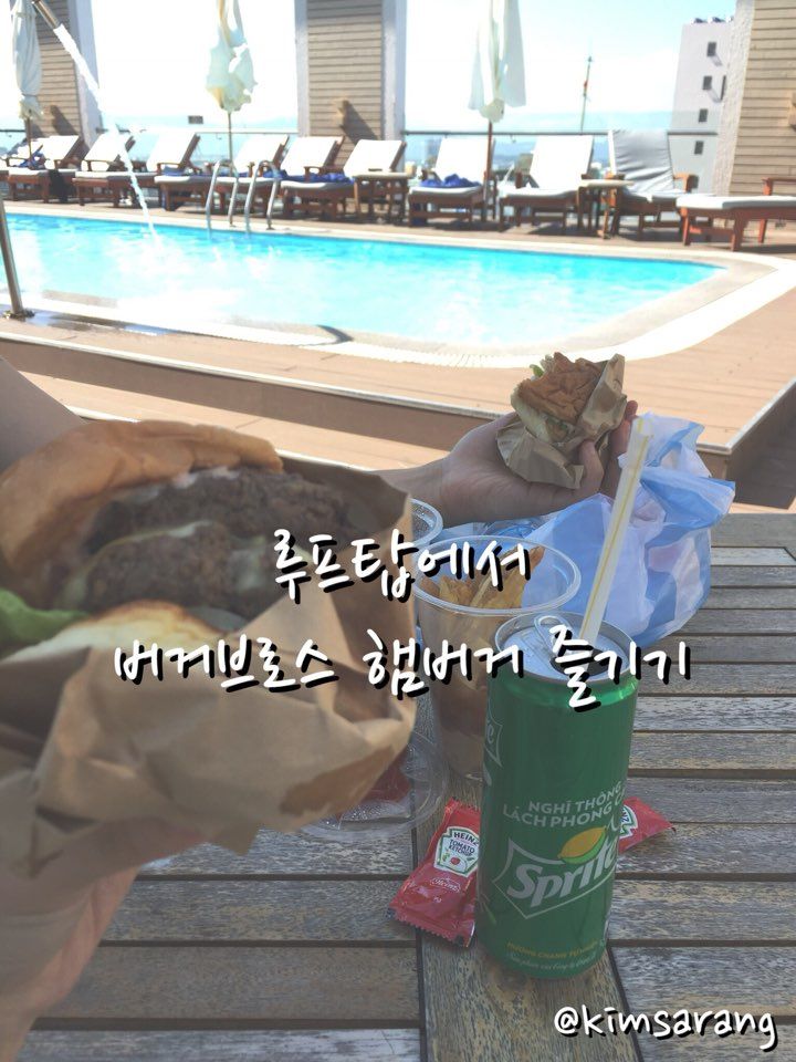 대부분의 미케비치 앞 호텔 위 수영장은 음식물 반입이 가능하고, 간이 테이블도 준비해놓았다고 해요!