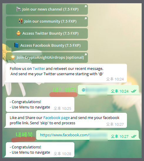 세번째 미션 완료 후 내트위터 계정은 골뱅이와 함께 입력하시고 네번째 미션 완료 후 내페이스북 계정 링크는 위와 같이 입력해 줍니다