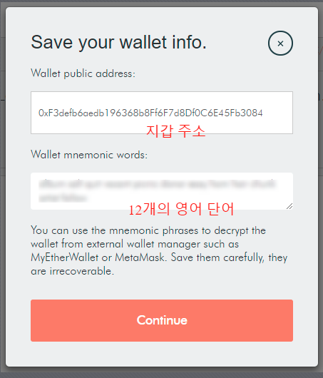 나의 지갑 주소와 12개의 영어 단어를 알려줍니다. 12개의 영어 단어는 이후 지갑에 접속할 때 반드시 필요한 나만의 고유 비밀번호와 같은 것이므로 안전한 곳에 저장!! 꼭 저장 해줍니다