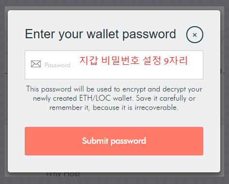 지갑 비밀번호를 설정하라고 합니다. 영문 숫자 조합 9자리를 입력합니다. 특수문자를 넣으시면 더욱 안전합니다