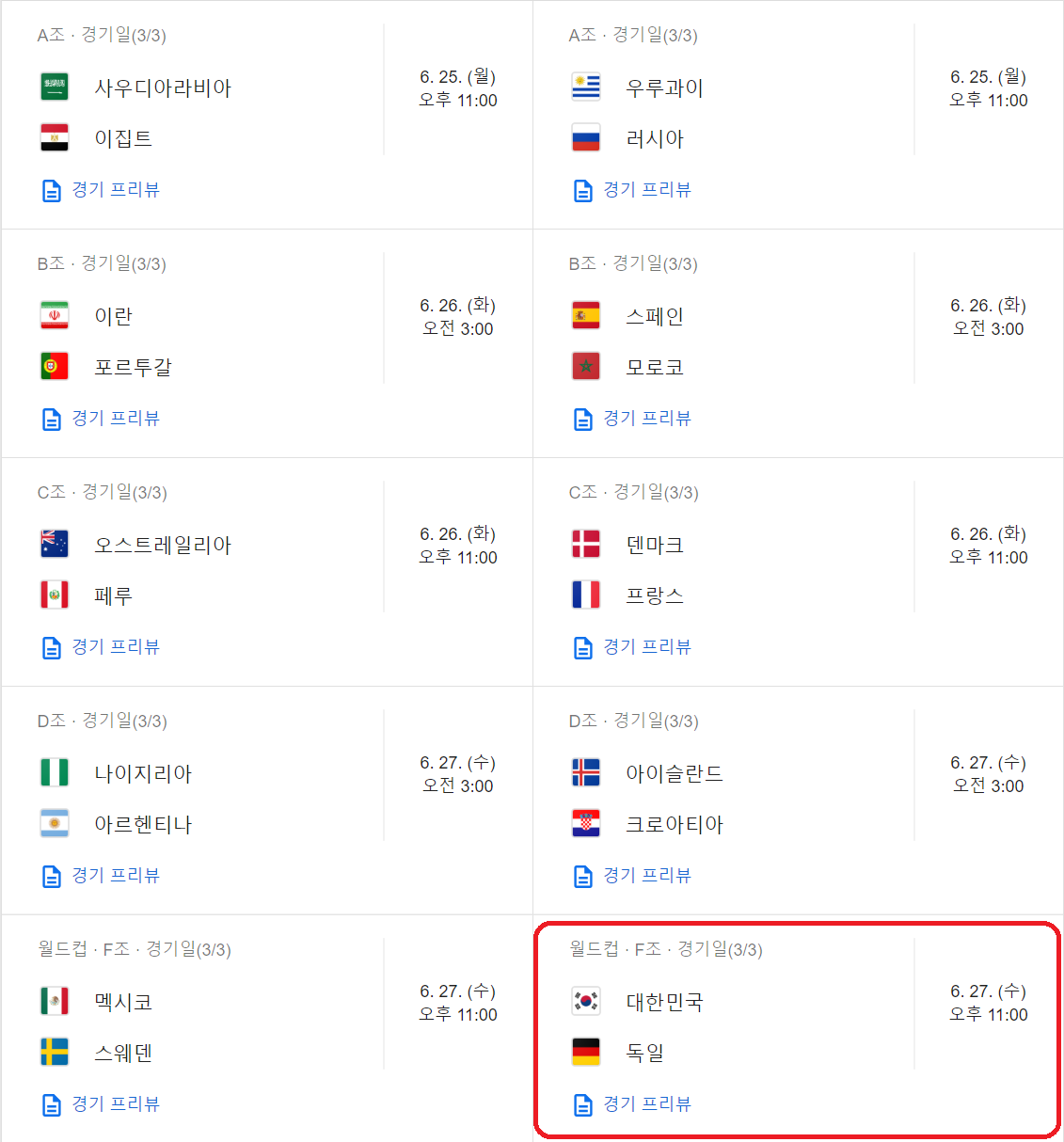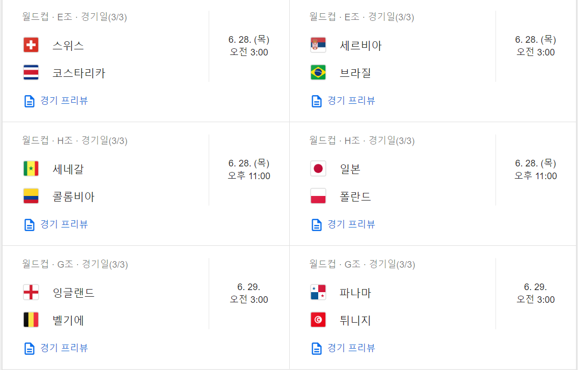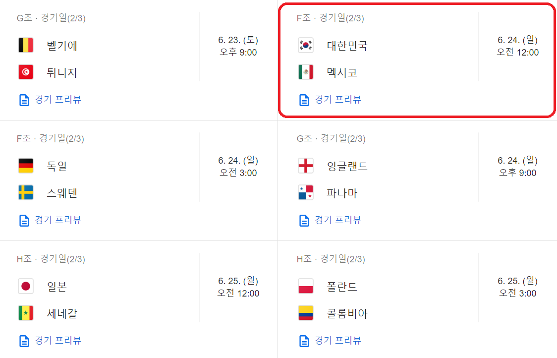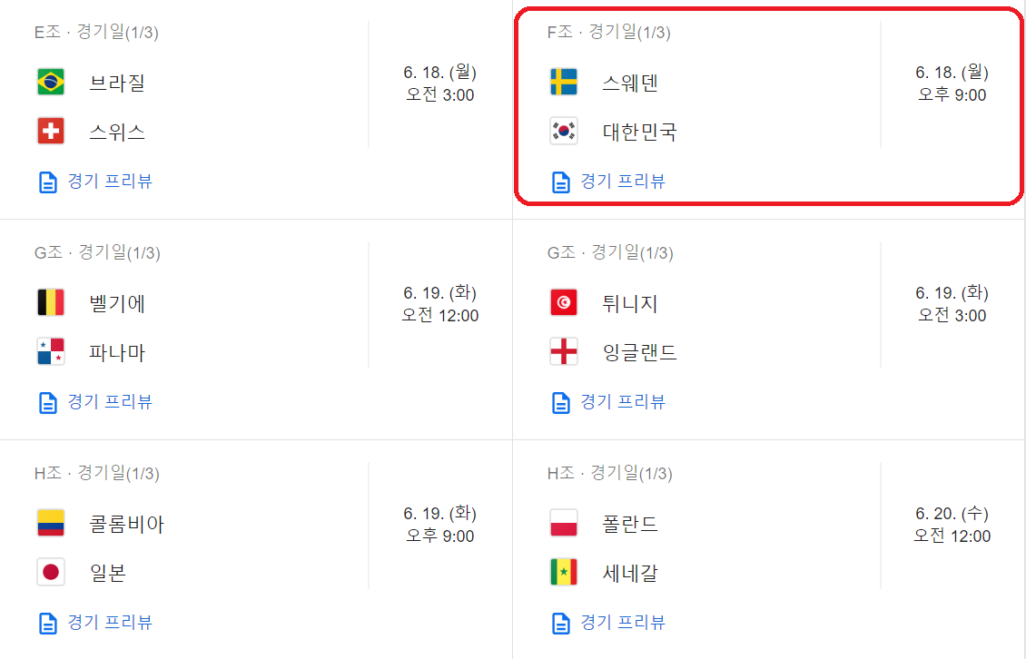 자 그러면 경기 일정을 안내 해 드리겠습니다. 우리나라 경기는 빨간색으로 표시 해 놓았으니 참고 하시구요 ㅎ