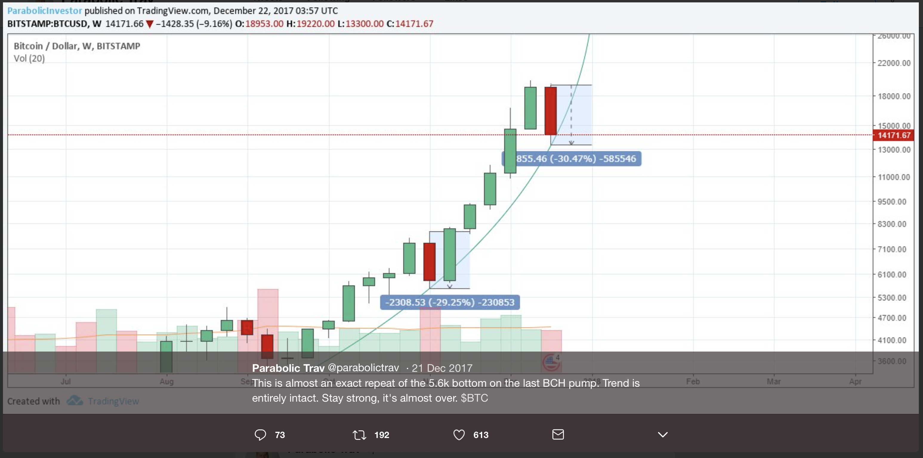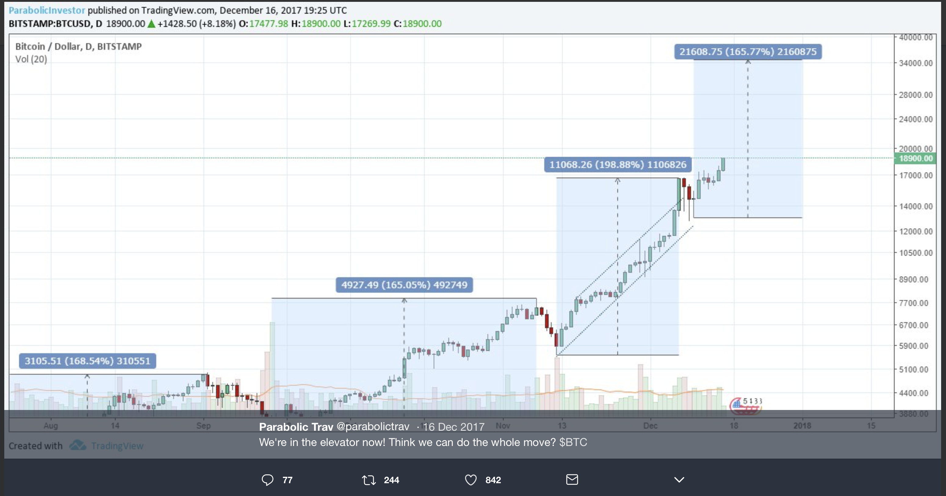 그는 당시 로그 차트상으로 지수적 상승을 이어가며 고점을 갱신해 가던 비트코인 차트에 파라볼릭 추세선을 덧입혀 5자리 비트코인의 시대가 도래했음은 물론 6자리 비트코인 가격도 근시일 내에 가능하다는 희망찬 예언을 한다.