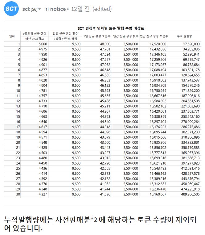 SCT는 초기 발행분을 제외하고앞으로 30년 간 4억 8천만개 정도의 토큰을 발행합니다. 앞으로도 매일 48000개 정도가 발행됩니다.