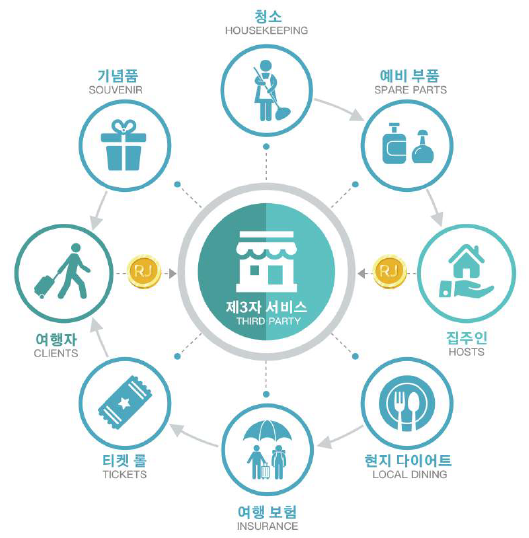 RabbitJets는 제3 서비스 업체와 제휴 관계를 구축할 예정이며, 제휴사는 반드시 호스트 혹은 여행객을 대상으로 여행/숙박과 관련된 서비스를 제공해야 합니다. 예를 들면 여행 보험, 비품, 화장용품, 청소, 음식 등 제공 및 서비스가 있습니다. 제3 서비스 업체는 RabbitJets 플랫폼에 신청서를 제출해야 하고, 서비스 제공 구역 및 가격에 대해 설명해야 합니다. 플랫폼의 평가 및 검증을 통과한 후 호스트 혹 여행객을 대상으로 서비스를 제공할 수 있습니다.