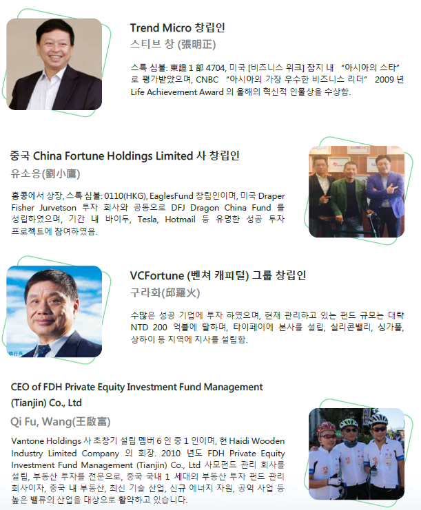 투자사로는 Eagle Fund(Baidu와 Tesla 등을 투자한 유명 투자사), Trend Micro(글로벌 보안 소프트웨어 기업), Fuxin Group(수출-제조 및 거래회사), Haidi Wood(투자사) 등이 있습니다.