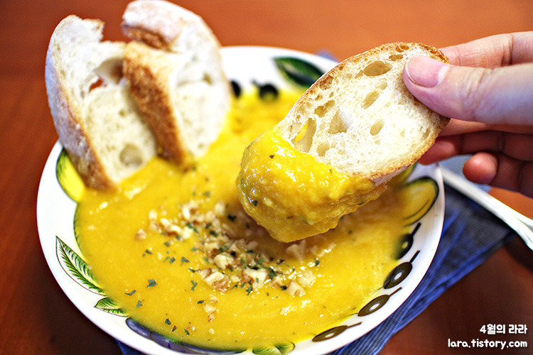 오늘 아침은 부드러운 단호박스프에 바게트 찍어 간단히 먹었습니다.