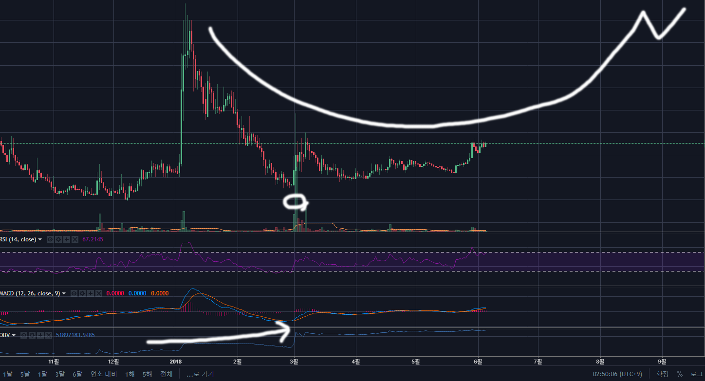 컵앤핸들 패턴을 드리며 컵의 바닥쪽에서 거래량을 동반하여 매집을 하고 있는 것이라는 설명을 보았습니다.
