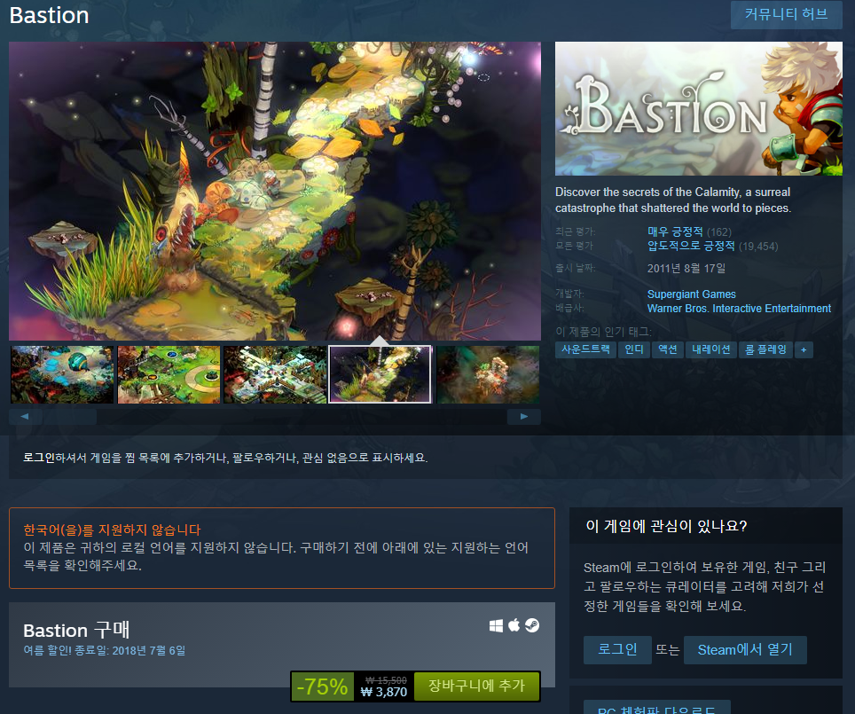 참고로 예전에 제가 추천 포스팅을 올렸던 Bastion도 할인을 하고 있습니다. 3,870원으로 부담없는 가격입니다!