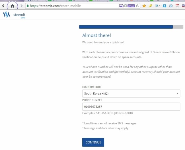 휴대폰 번호 입력은 실제 사용하는 휴대폰 번호 입력하시고 continue 눌러줍니다 ^^