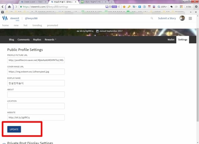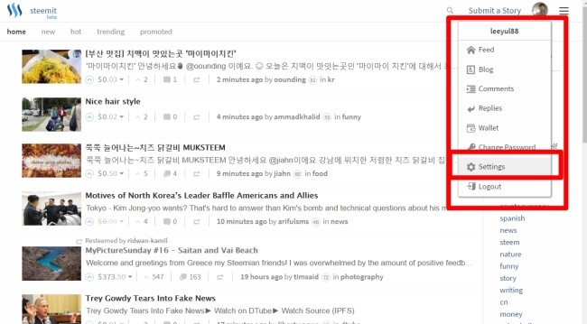 위 순서대로 진행하면 스팀잇 설정화면으로 이동합니다^^