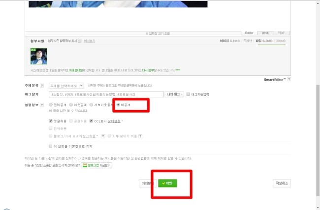 "설정정보"에서 공개상태를 "비공개" 로 클릭