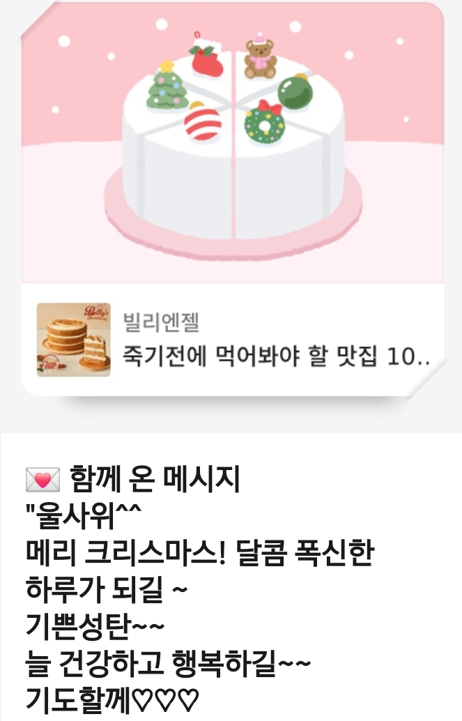 2024성탄을 맞으며 올해는 부부싸움한 딸과 사위에게 선물을 당근케익과 딸기를 모바일상품권 보내고 큰올케에게도 남친에게도 동일한것으로 선물했다.