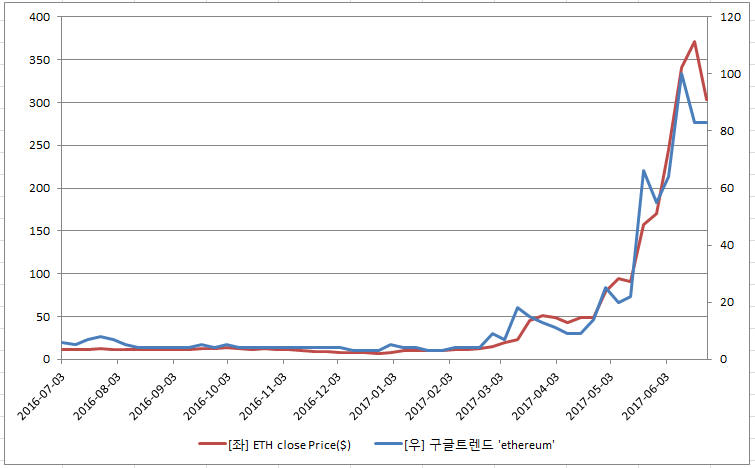 구글트렌드의 'ethereum' 검색추이와 이더리움(ETH) coin price를 최근 1년을 놓고 보면 위 그림과 같이 유사히 움직임을 알 수 있습니다.