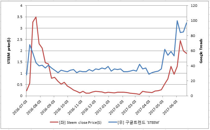 그래도 STEEM에 대한 구글트렌드와 STEEM의 coin price는 거의 비슷한 흐름을 보임을 알 수 있습니다.
