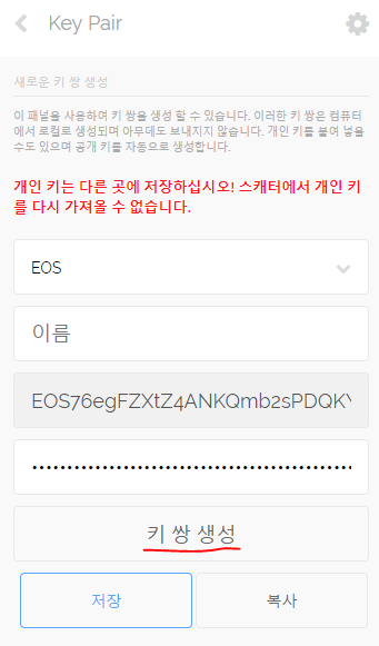 4.아래 "키 쌍 생성" 을 누르시면 아래 화면처럼 키 쌍이 생성되는데, 복사를 누르시면 위에 있는 퍼블릭키와 프라이빗키가 클립보드에 복사된 상태로 저장되게 됩니다. 그 후 저장 버튼을 누르시고 메모장이나 한글파일에 CTRL+V 붙여넣기 기능을 통해 옮겨 보관하시면 됩니다.