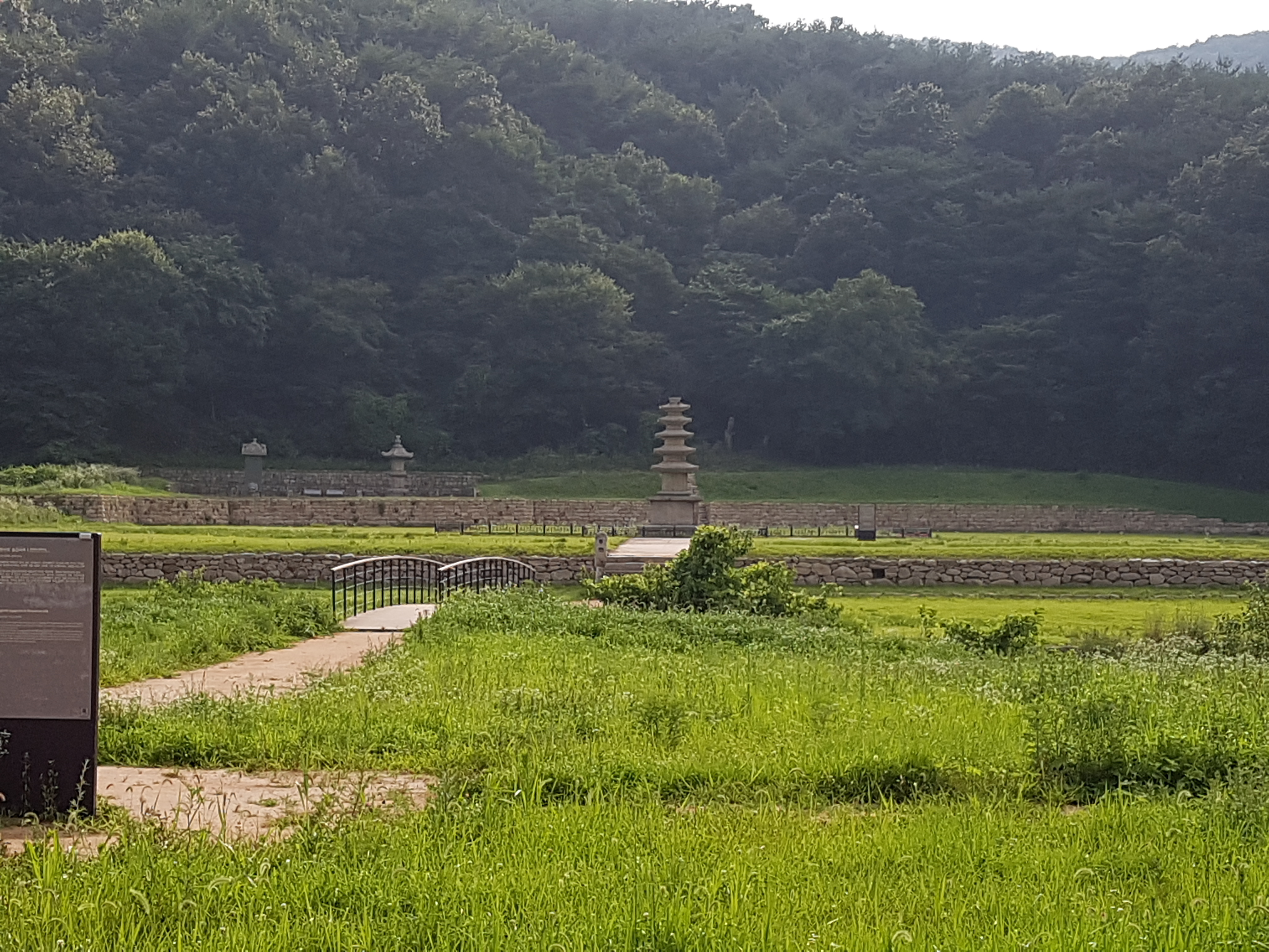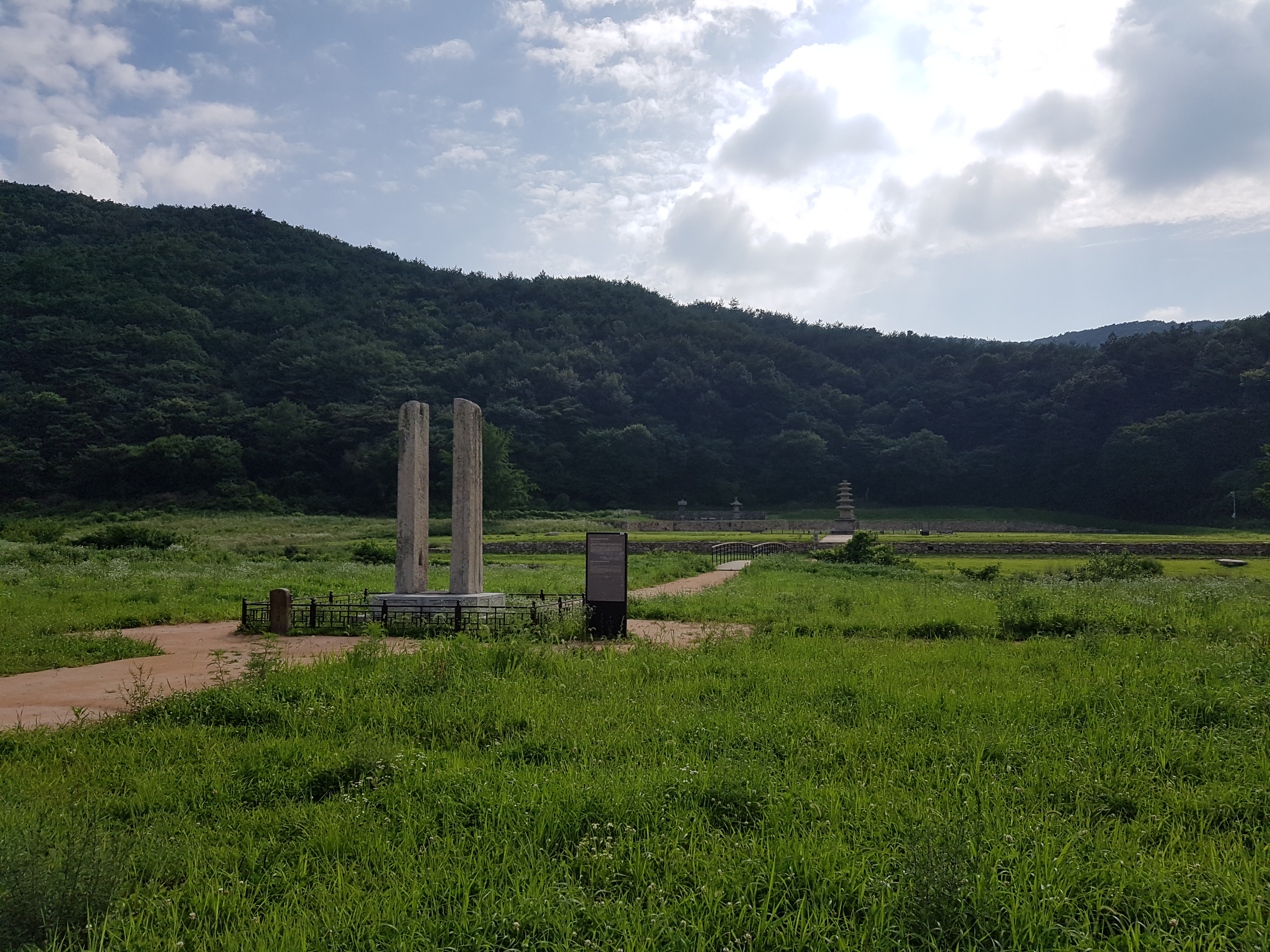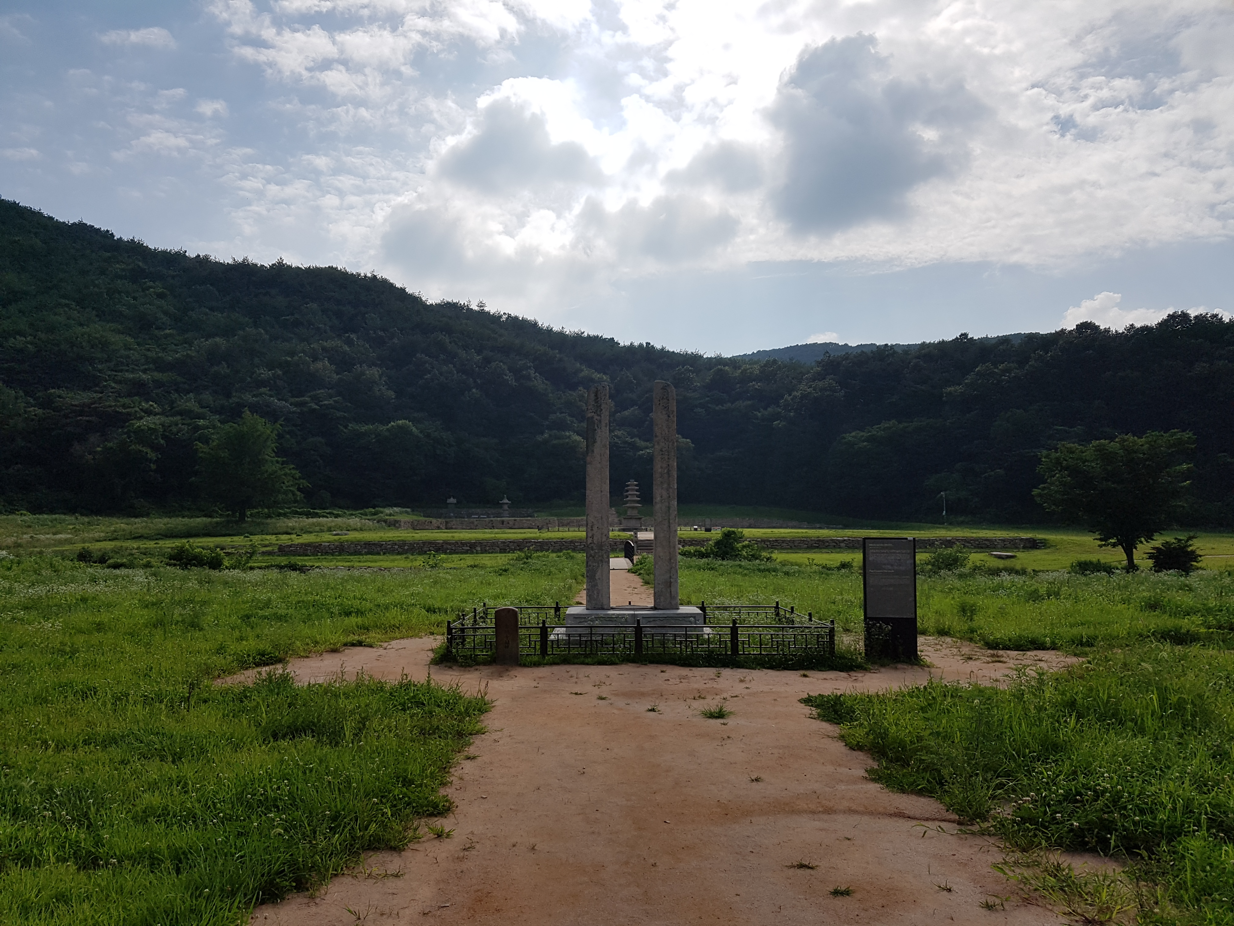 산 아래 평지에 잡초만이 무성하게 자라고 멀찍이 석탑과 부도가 황량하게 서있고, 그 앞에는 커다란 돌기둥이 나란히 서있는 오래된 사찰의 터였다.