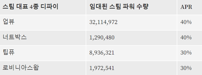 스팀 대표 4종 디파이에 임대된 스팀 파워 수량 : 44,314,314