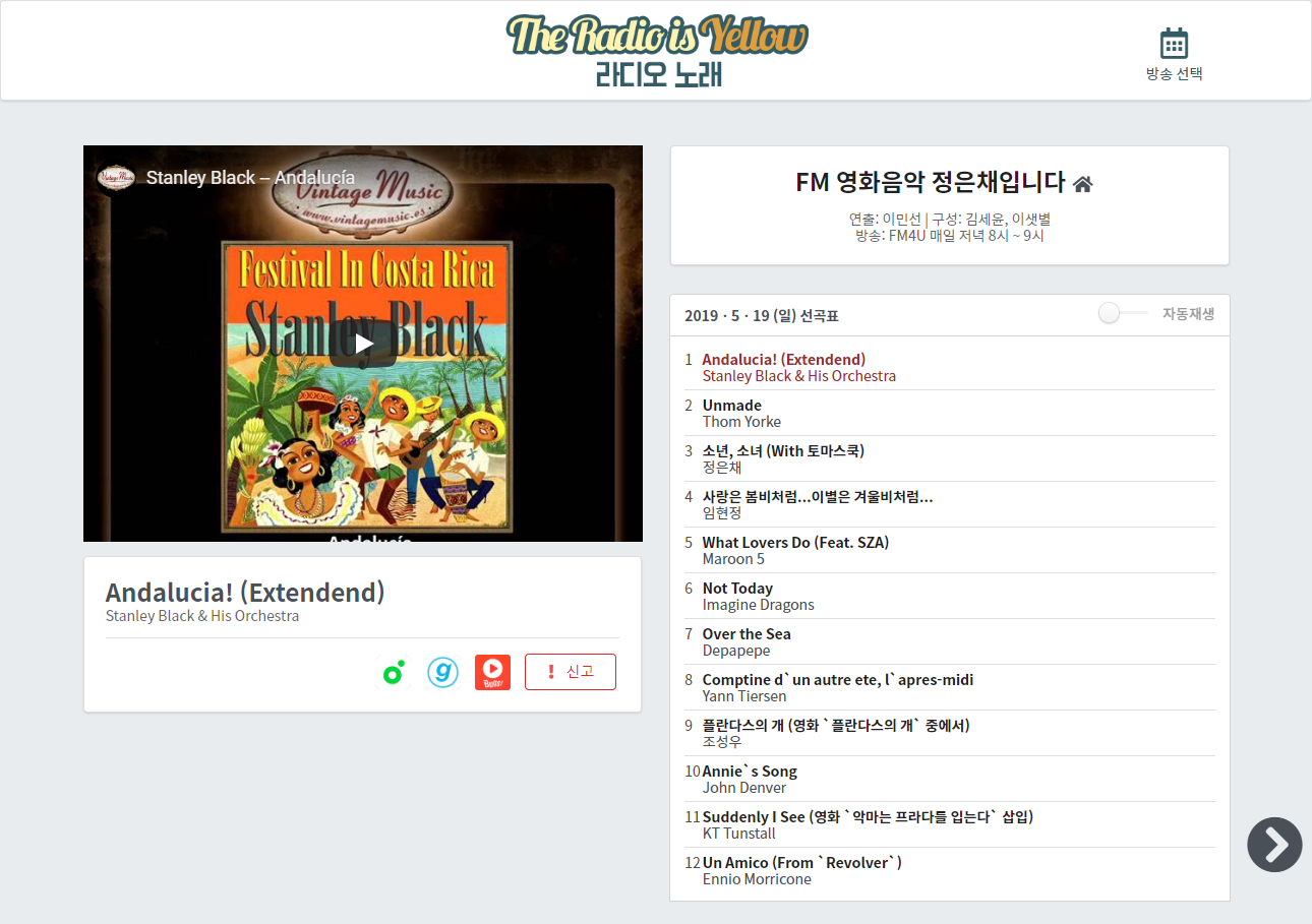 라디오 선곡을 날짜별로 찾아 들어볼 수 있는 사이트인데요.