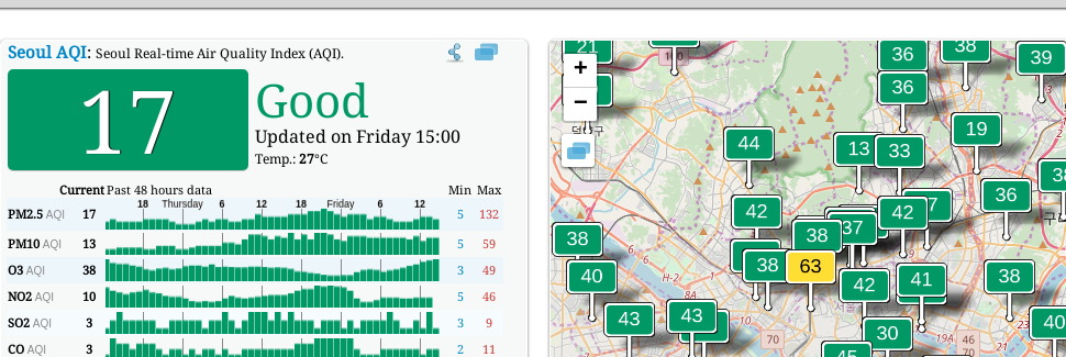서울 대기오염 지수manimore (65)in #kr • 7 years ago 마니모어는 대기오염 지수(AQI)를 제공합니다. 숫자가 높을수록 안좋습니다. 100이상이면 안좋고 150이상 빨간색이면 상당히 안좋은 상태입니다. 자료출처: aqicn.org 빨간색뜨면 마스크 준비하시기 바랍니다. 감사합니다. #kr-event #kr-life #mini