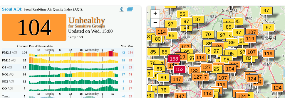 서울 대기오염 지수manimore (65)in #kr • 7 years ago 마니모어는 대기오염 지수(AQI)를 제공합니다. 숫자가 높을수록 안좋습니다. 100이상이면 안좋고 150이상 빨간색이면 상당히 안좋은 상태입니다. 자료출처: aqicn.org 빨간색뜨면 마스크 준비하시기 바랍니다. 다들 힘냅시다. #kr-event #kr-life