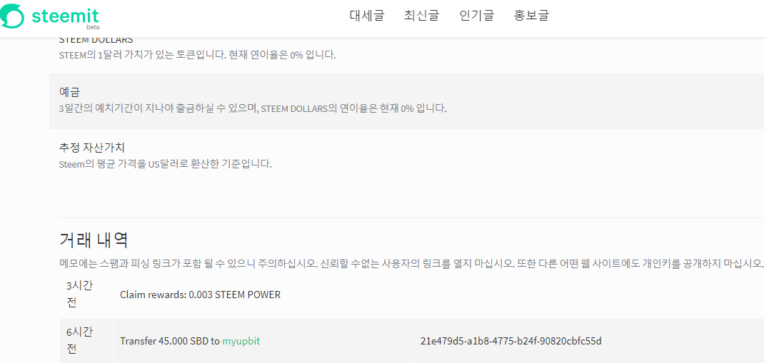 업비트 앱을 키고 입출금 - 스팀 또는 스팀달러를 누른 후 입금하기 버튼을 누르면 이렇게 내 지갑 주소를 받을 수 있습니다. 별 어려움 없이 송금을 완료합니다.