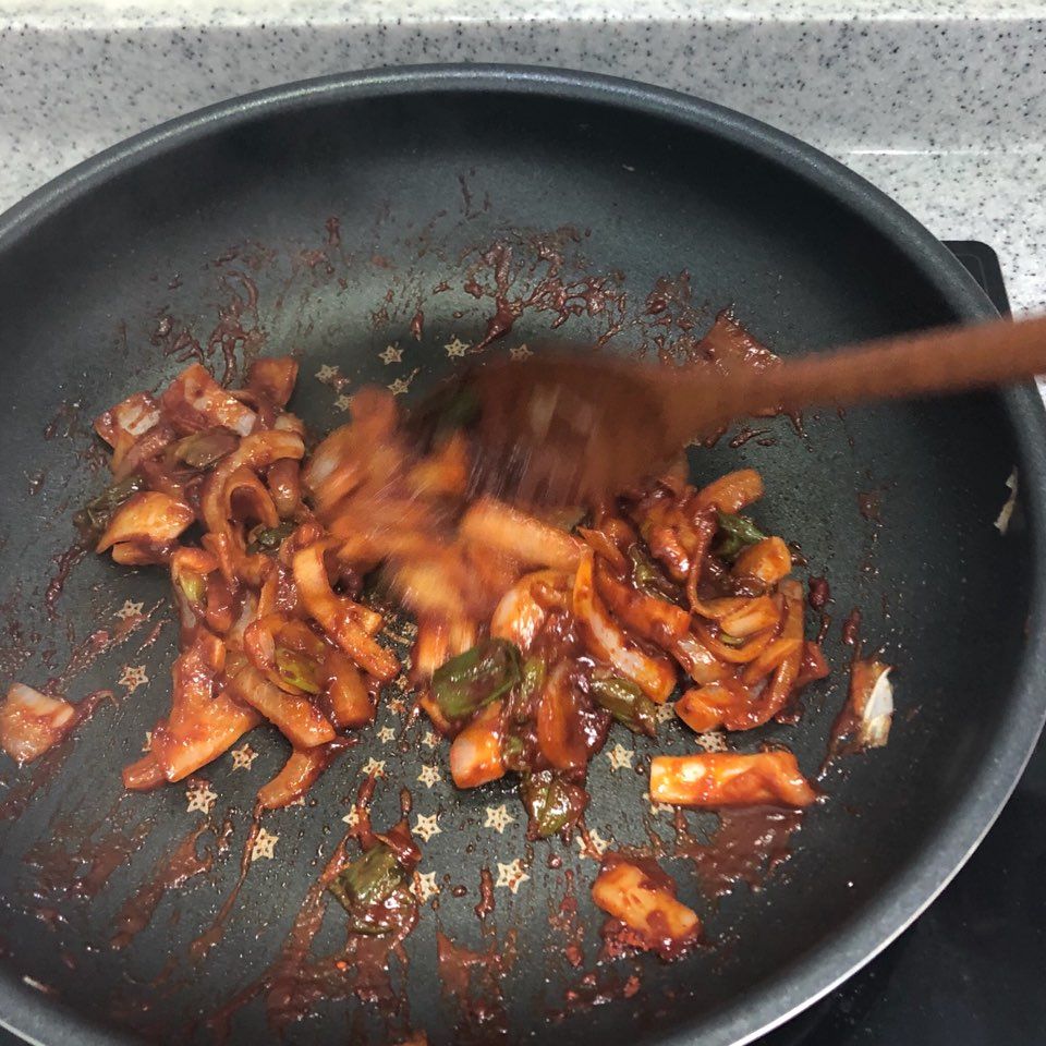 고춧가루 한스푼을 넣고 볶아줘요.