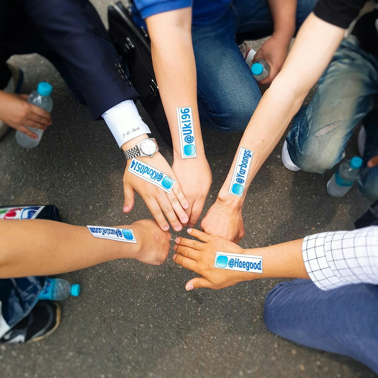 서울역에서 모인 참여자들이 팔에 스티커를 붙이고 인증샷을 찍은 모습입니다.