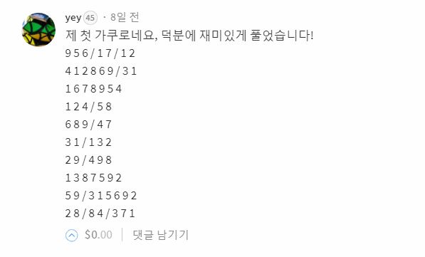 첫 가쿠로 퍼즐이라 해주셨지만 너무나 잘 풀어주셨네요.