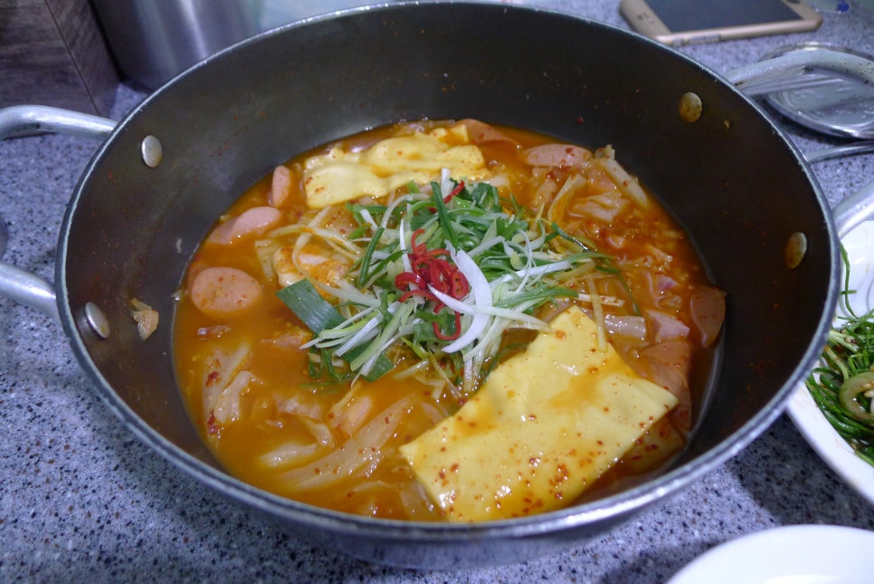 Budae-jjigae(literally "army base stew") is a Korean style stew made normally with ham, sausage, baked beans, kimchi and other vegetables. It was created after the Korean War using the scrounged or smuggled surplus foods from the U. S. army bases - people were starved to death this time. So, basically this dish has got a sad history for Korean people.