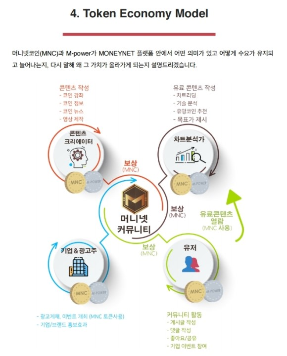 머니넷 백서에 나와있는 토큰 이코노미 모델을 보면 아시겠지만, 머니넷은 기획 단계부터 기업들 정확히 말하면 광고주들의 참여를 사업의 큰 한 축으로 설정해두고 있습니다. 우리가 돈(코인)을 찍어낼 수 있으니까 광고 필요없다고 했던 스팀잇과 달리, 머니넷은 기업/광고주로부터 돈이 들어와서 그게 머니넷의 유저들에게 돌아가게끔 설계를 해두었습니다. 단, 광고주가 광고비를 현금으로 결제하는게 아니라 머니넷코잇으로 결제하게끔 해둔 게 스마트합니다. 머니넷 커뮤니티에서 광고를 하려는 기업들은 머니넷코인을 거래소에서 사야 하니까, 시장 수요가 올라가 머니넷코인의 가격이 유지되는 구조를 만든 것이죠.