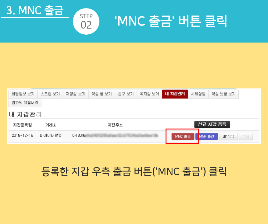 STEP 02 - 등록한 지갑 주소 우측의 'MNC 출금' 버튼을 클릭합니다.