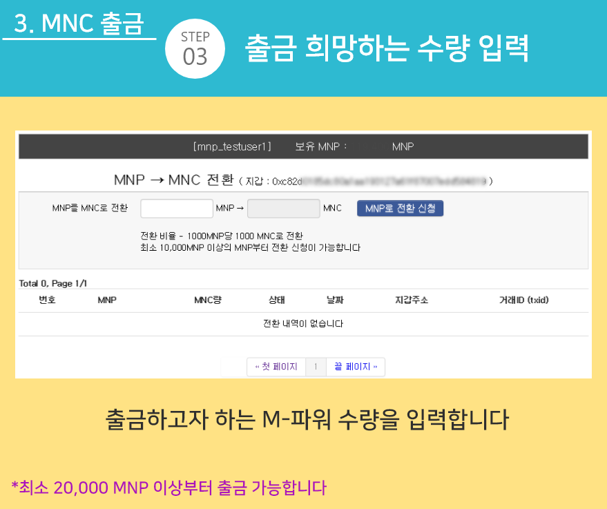 ※ 최소 출금 가능 MNP(기존 '포인트')는 20,000 MNP 이상입니다.