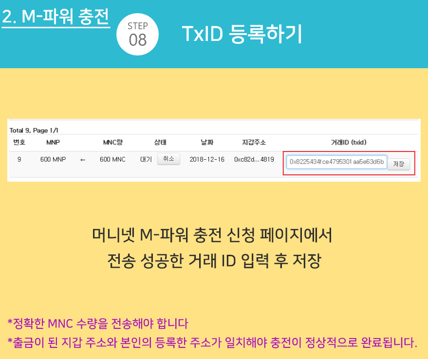 ※ 트랜젝션 ID를 확인하여 정상적이지 않은 Txid 입력시 해당 MNP는 회수될 수 있습니다.
