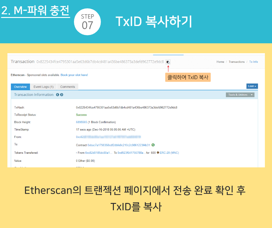 STEP 07 - 전송이 성공적으로 완료된 Transaction ID(TxHash)를 복사합니다