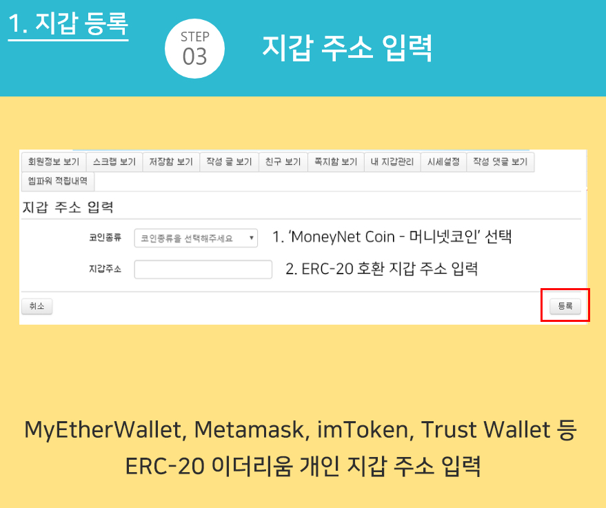 이상으로 머니넷 포인트(MNP) 입출금을 위한 지갑 등록과