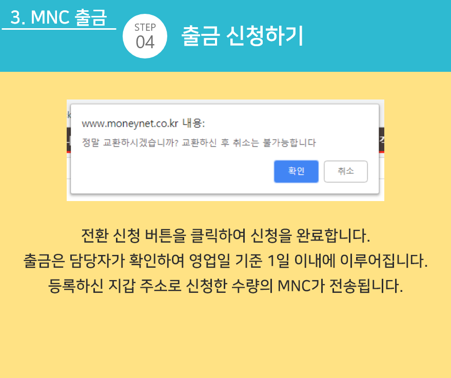 ※ MNC 출금은 영업일 기준 1일이 소요되며, 담당 직원이 확인하여 트랜잭션을 처리합니다.