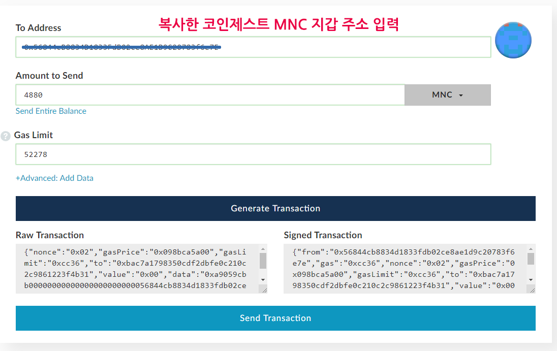 'To Address'에 본인의 코인제스트 머니넷코인(MNC) 입금 주소를 입력합니다.