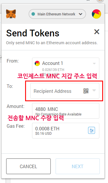 8. 전송할 코인제스트 지갑 주소와 MNC 수량을 입력합니다.