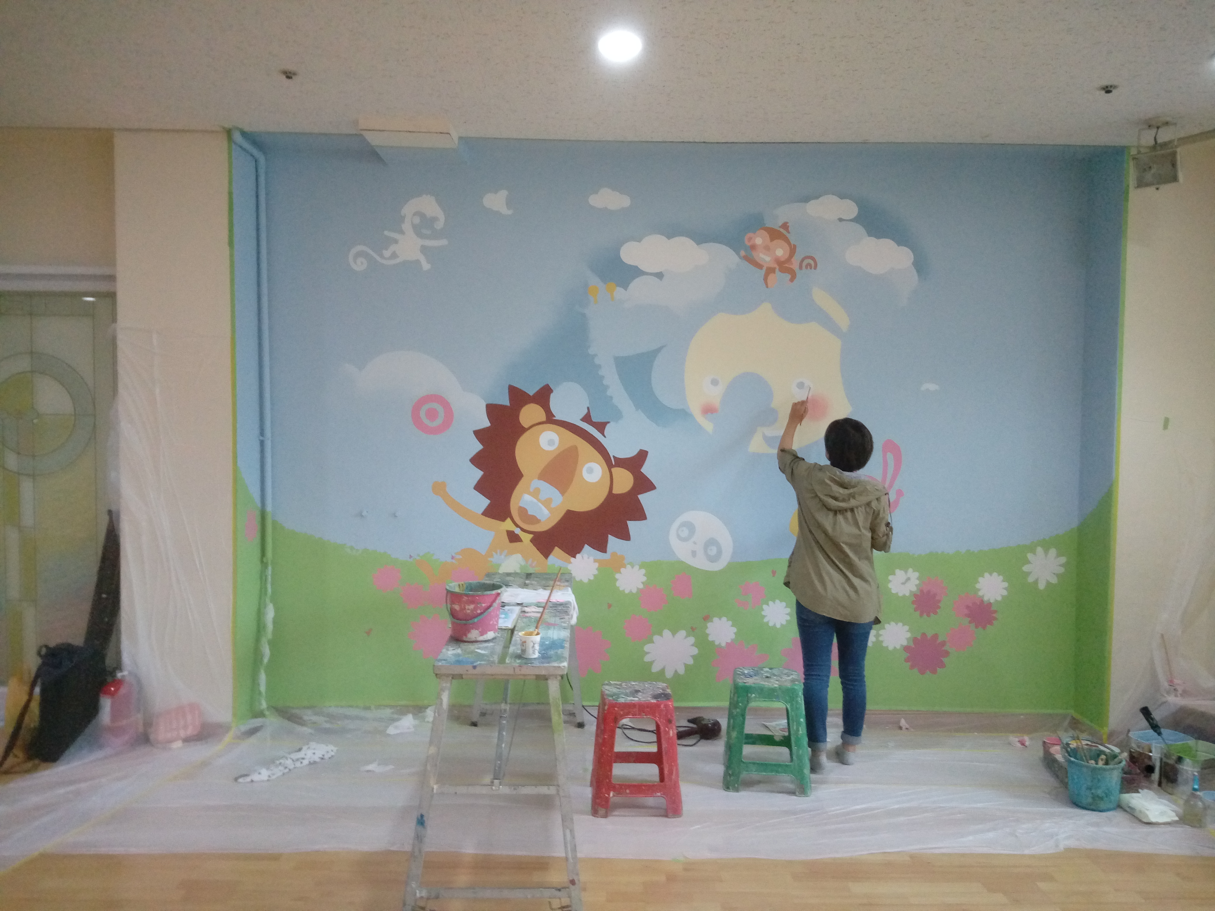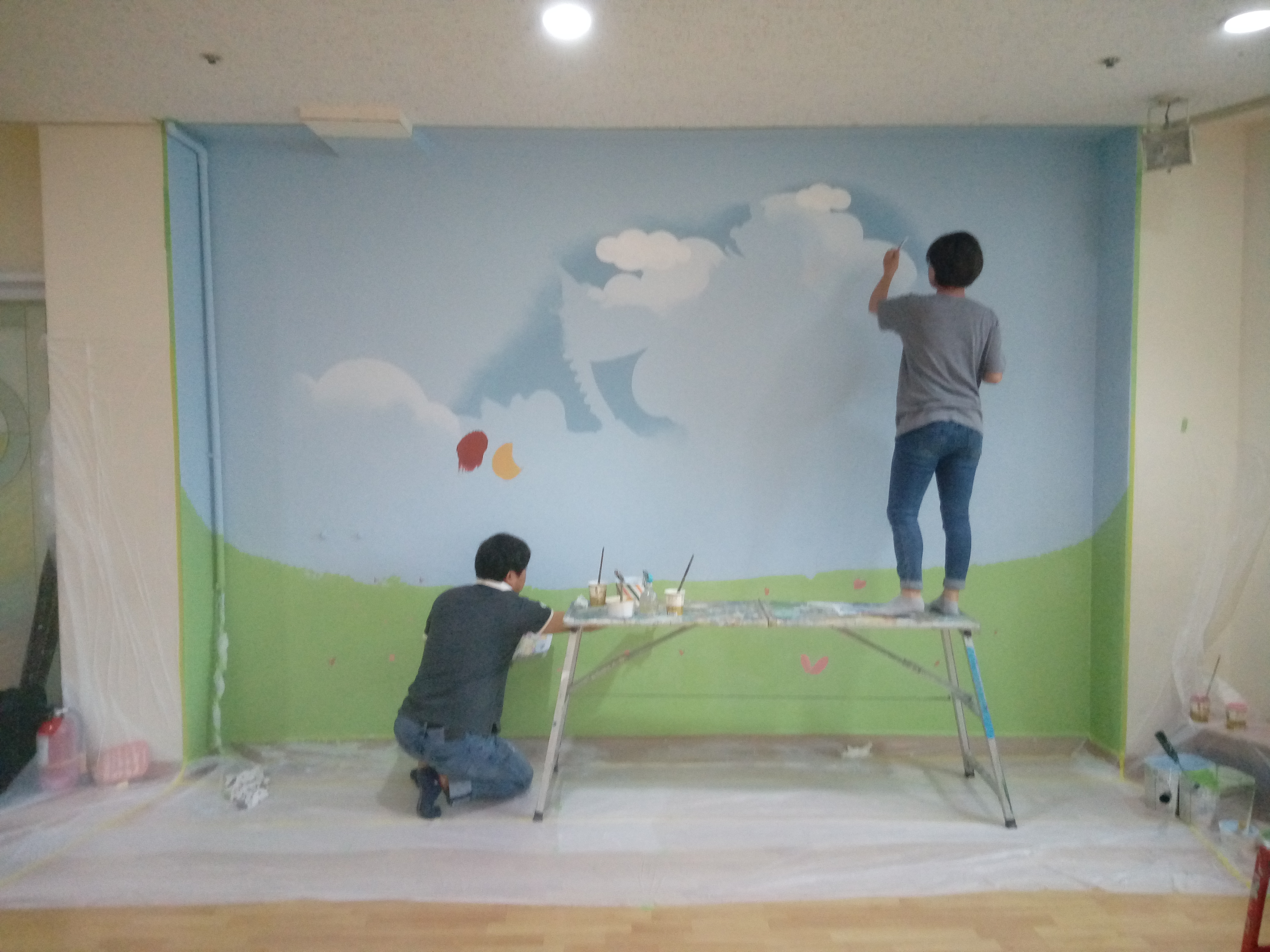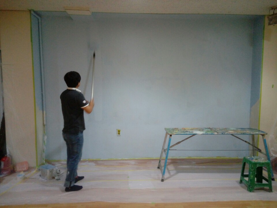기본 베이스로 하늘색 칠을 합니다. 보통은 새로 인테리어한 곳에 벽화 작업을 했었는데 앞전에 작업한 이미지를 덥고 다시 작업하기는 저에겐 처음 이었습니다.