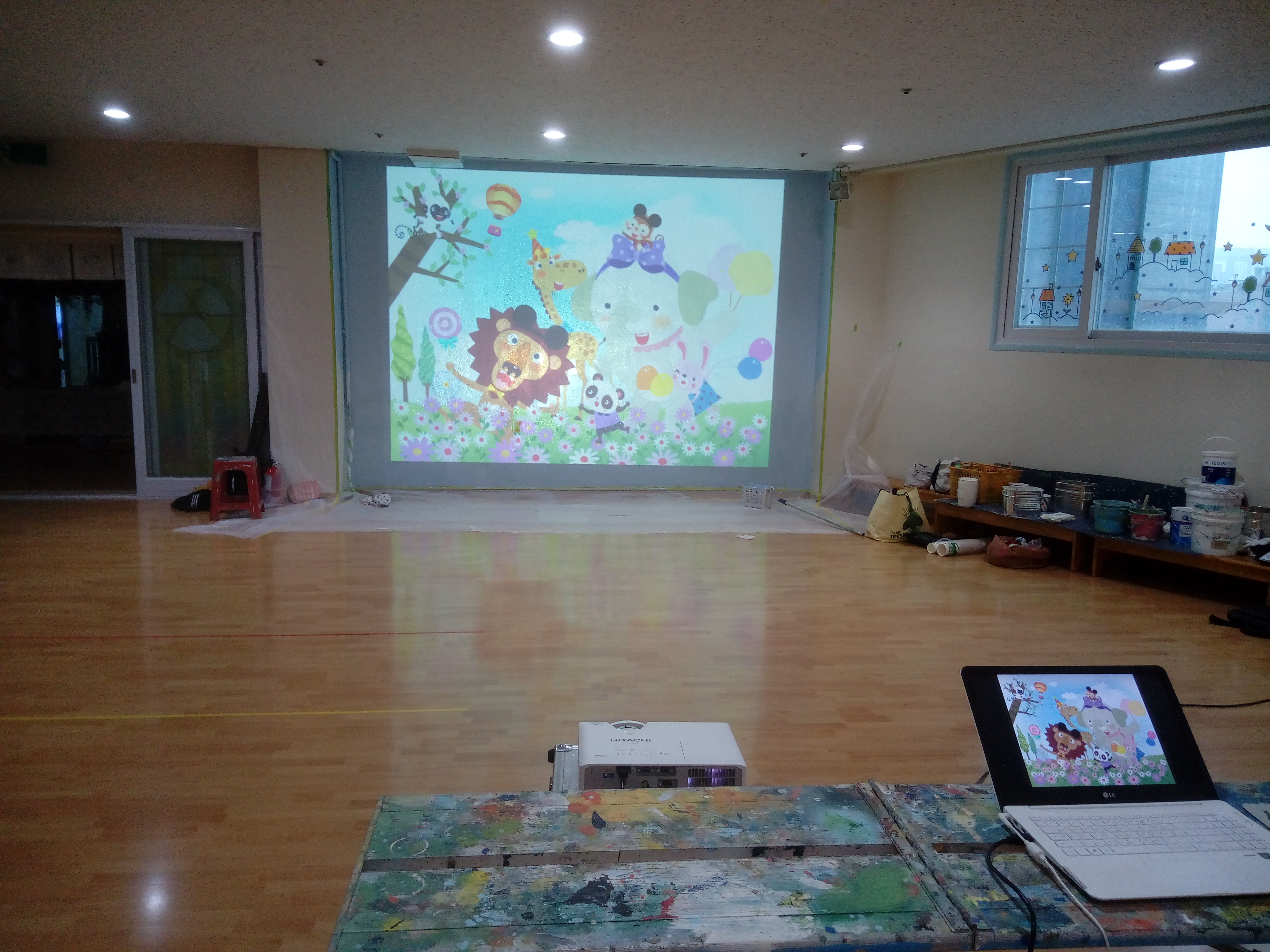 스케치 시간을 벌기 위하여 빔프로젝트를 사용하였습니다. 복잡한 이미지와 알록달록한 컬러. 한사람이 작업했다면 2일은 소요될 작업량이었습니다.