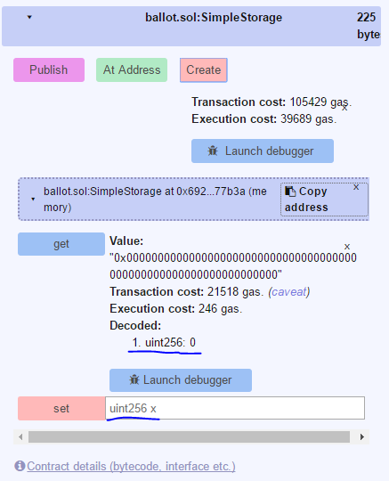 보시면 get 밑에는 uint256: 0이라는 말이, set 옆에는 빈 칸이 있는걸 볼 수 있습니다. 아까 이 컨트랙은 숫자 하나를 저장하는 기능을 한다고 말씀드렸죠. uint256: 0은 현재 저장된 값이 0이라는 뜻입니다. 이더리움은 초기값을 모두 0으로 설정하기 때문입니다.