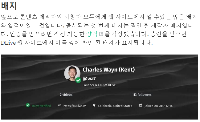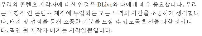 디라이브는 디라이버들을 위한 별도의 배지도 만들었습니다. 현재까지 출시된 배지는 크리에이터 배지(Creator badge)입니다. 디라이브에서 정식으로 활동하는 유저임을 인증하는 배지인데요. 트위치의 제휴 스트리머 기능의 전 단계가 아닌가 생각합니다. 디라이브가 디라이브에서 활동하는 유저임을 공식으로 인정하는 것이니까요. 배지는 시작일 뿐이라는 걸 보면, 디라이브를 통해 인증 받은 크리에이터들은 향후 디라이브가 ver 1.0 출시될 때쯤하여 배지 외에도 더 많은 혜택을 받지 않을까 하는 생각이 듭니다. 전문적인 디라이브 창작자들을 양성하여 디라이브의 판을 키우려는 계획이라 봅니다. 물론 디라이브의 판이 더 커진다면, 저 배지를 다는 것 자체가 하늘의 별따기가 될 것입니다. 그 만큼, 크리에이터 배지를 단 유저들의 의무도 더 커지겠죠.