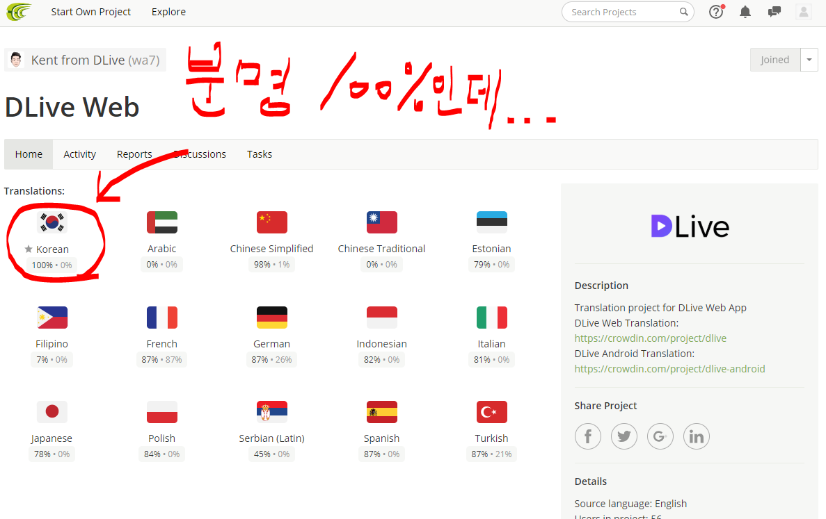 이전 버전에선 멀쩡히 나왔던 한국어 번역들이 0.8.2 업데이트 이후로는 전혀, 한 글자도 번역된 기록이 보이지 않았습니다. 영상 업로드 화면은 물론이고, 생방송, 동영상, 방송하기, 심지어 프로필과 설정창까지 모두 한글이 빠지고 영어로 싹 바뀌었네요. 다른언어도 그런가 봤더니... 일본어, 중국어, 독일어, 폴란드어, 이탈리아어..... 등등 다른언어들은 멀쩡히 번역단어들이 나오는데 왜 한국어만..... 분명 디라이브에서 제공한 번역문들의 번역률이 100%인데... 심지어 번역률이 일본어, 독일어 보다 더 높은데도 불구하고.... 한국어만 왜 전부 영어로 초기화 된걸까요? 한국어 번역이 통째로 사라졌나 하고 번역프로젝트를 봤더니 멀쩡히 있더군요.