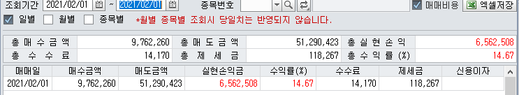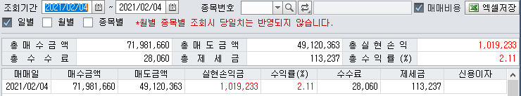 2021년도 1,2,3,4 번째 수익msryu (47)in #kr • 5 years ago 4번 매도해서 수익이 많이 생겼습니다. 올해는 시작이 좋네요. #stock #kospi #kosdaq