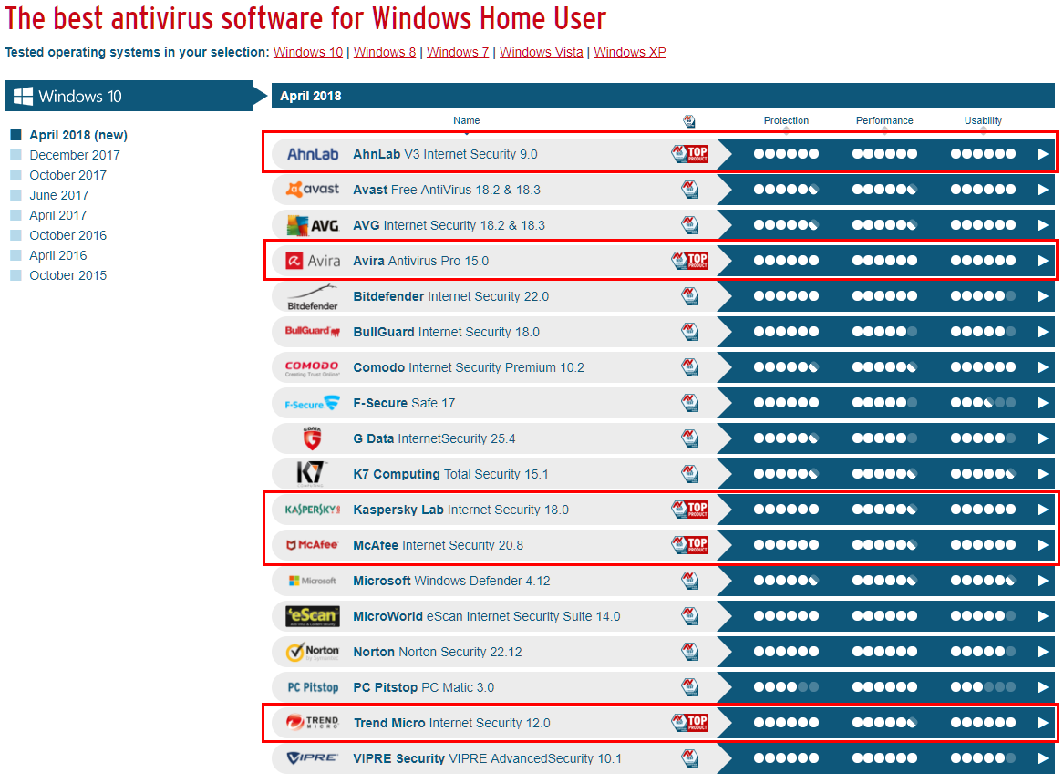 모든 평가에서 AhnLab, Avira, Kaspersky Lab, McAfee, Trend Micro가 가장 높은 평가를 받고 있습니다.