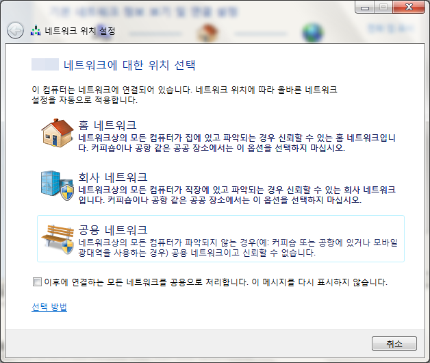 그래서 안내에도 불구하고 홈 네트워크나 회사 네트워크로 선택하시는 경우도 있을텐데요..대부분은 안그러겠지만..
