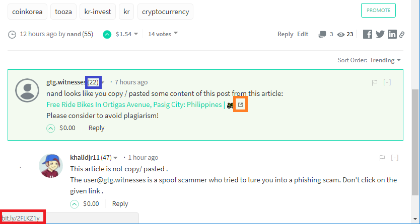 저사람은 사기꾼이고, 피싱 스캠(사기)이니까 링크를 클릭하지 마라는 대댓글이었습니다.